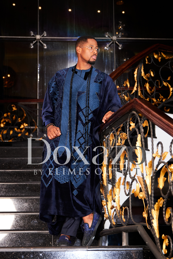 From the rich velvet that whispers opulence to the precision of geometric patterns that echo strength, every detail is a masterpiece of tradition and modern refinement. The beaded accessories add a finishing touch of dominance, while the shimmering footwear speaks of a life adorned with class.